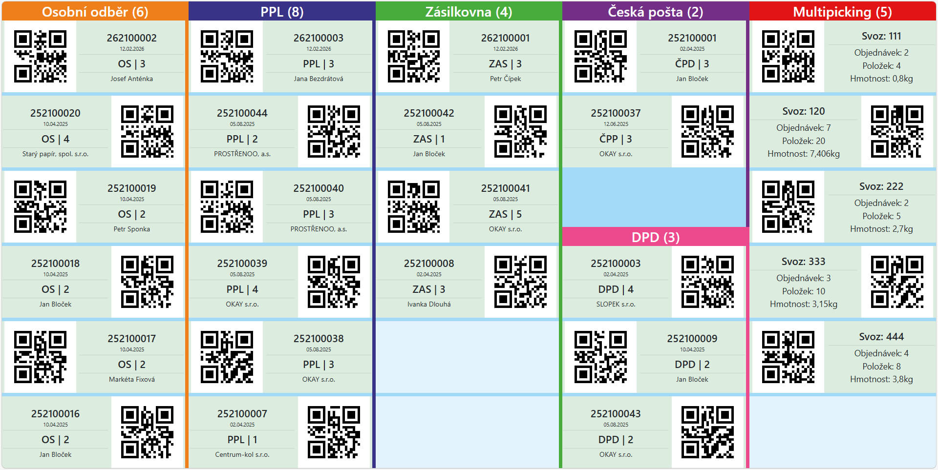 Interaktivní seznam objednávek k expedici, rozdělený např. dle dopravců a tím priority podle časů jejich nakládek. Skladníci zde vidí základní informace o objednávce (hmotnost, počet položek, nadrozměrné položky apod.) a výběr objednávky do mobilního terminálu plusMobile provádí přímo naskenováním QR kódu z obrazovky.