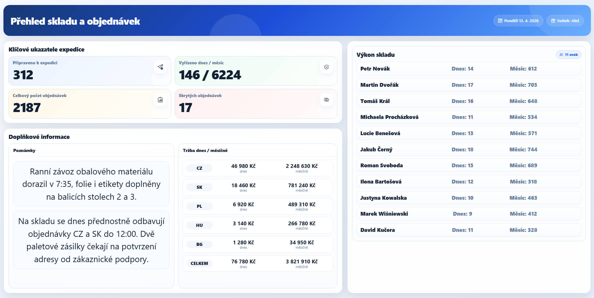 Přehledná nástěnka, která zobrazuje aktuální statistiku průběhu expedice – počty objednávek a položek k vykrytí, stav hotové expedice vzhledem k celkovému počtu objednávek atd.