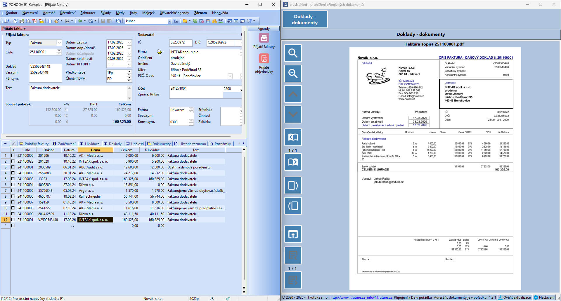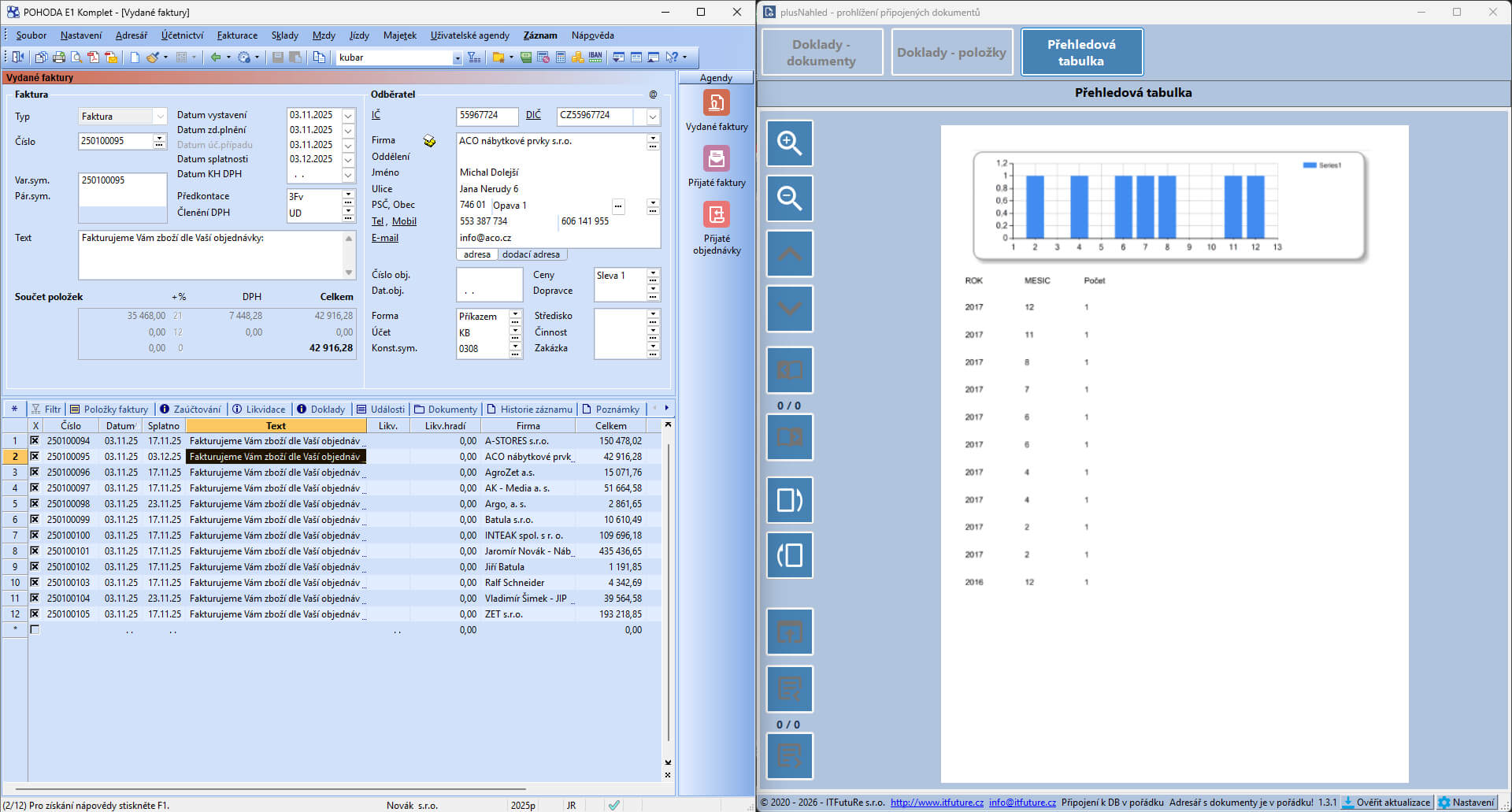 Aplikace plusNáhled se spouští v samostatném okně. Díky tomu je možné ji mít otevřenou na druhé obrazovce, případně na jedné vedle okna s Pohodou. Aplikace umí pracovat nad více účetními jednotkami a pozná, ve které agendě a na kterém dokladu se nacházíte. Jakmile u dokladu zjistí přiložené soubory, okamžitě je zobrazuje v náhledovém okně. Není potřeba nic otevírat ani hledat.
