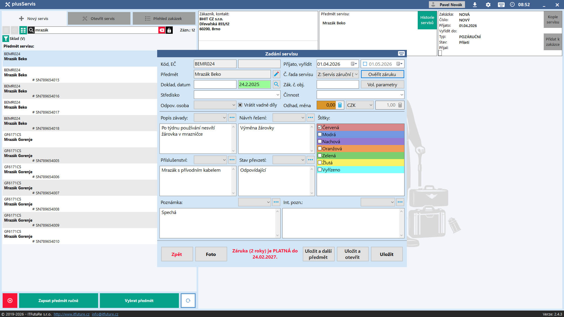 - při výběru předmětu z databáze se automaticky ověřuje platnost záruky a prodlužuje dobu záruky i o trvání starších záručních servisů na vybraný předmět servisu