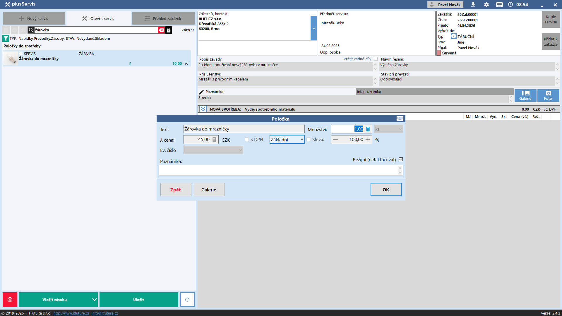 - nastavitelné vkládání jména přihlášeného technika do poznámky položky servisu (přenáší se do vyúčtovacího dokladu)