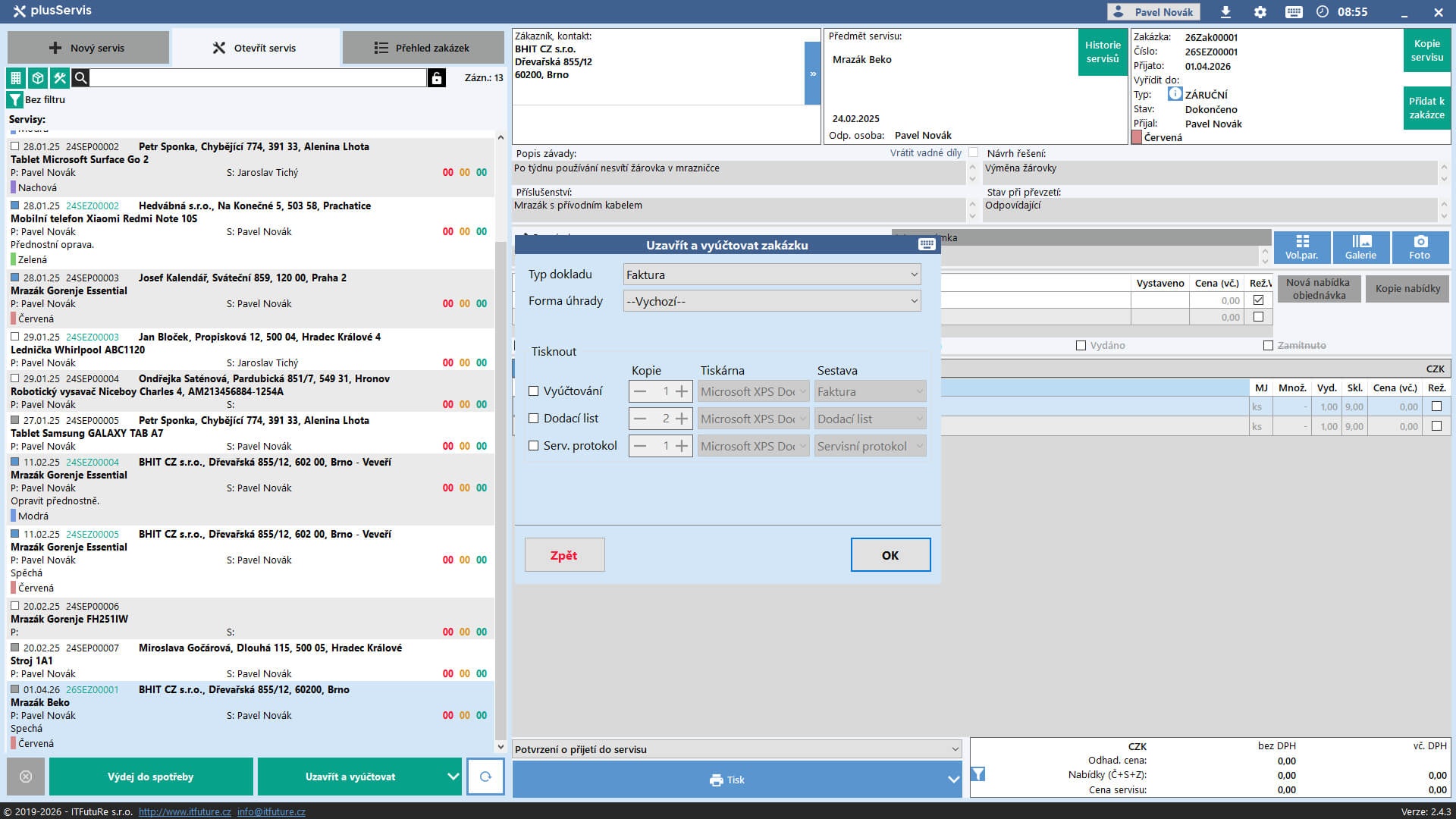 - vyúčtování servisu je možné provést fakturou, prodejkou nebo výdejkou