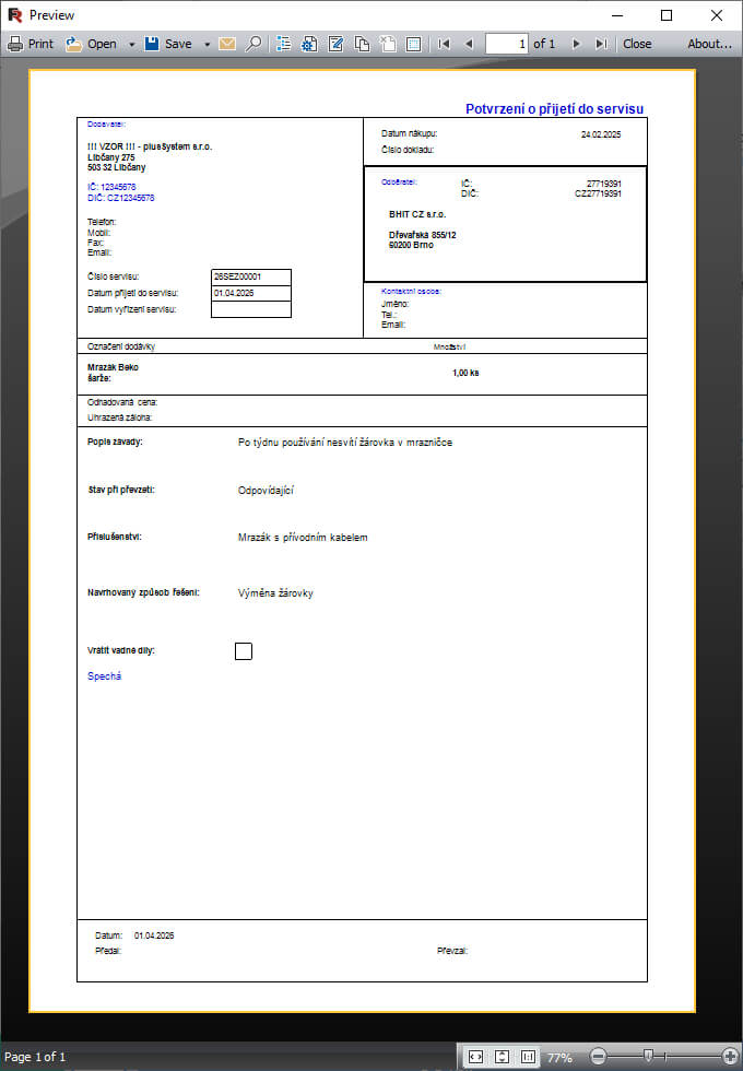 - tisk přijímacího protokolu a případně i štítků pro označení jednotlivých částí, aby se nepoztrácely