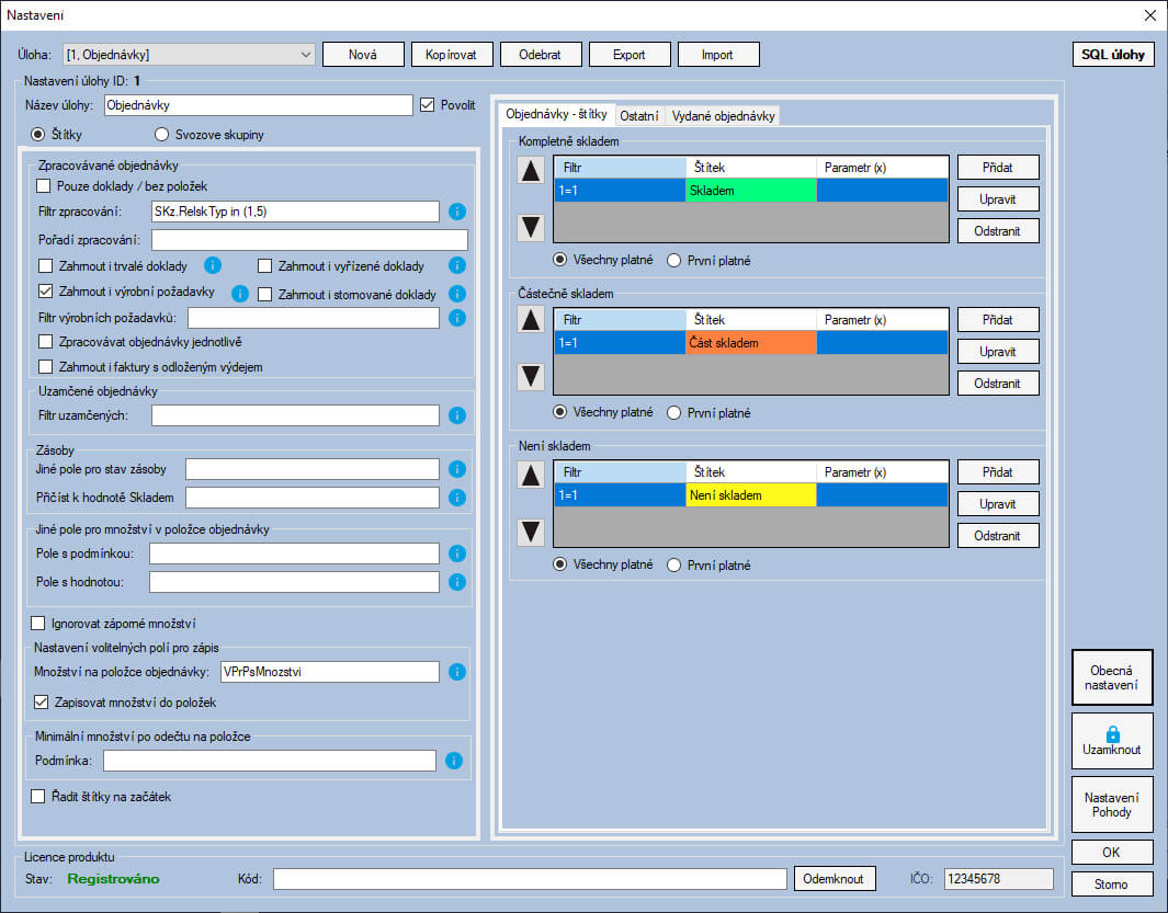 Pro každou úlohu je možné nadefinovat vlastní sadu štítků pro tyto tři stavy: Kompletně skladem, Částečně skladem a Není skladem. Pro každý z uvedených stavů je možné nastavit a filtrem definovat libovolný počet štítků, jejich názvů a barev (tak, jak se mají zobrazovat v Pohodě). Nemusíte se tak omezovat na jediný barevný štítek pro jednotlivé stavy, ale u jedné objednávky může být zobrazeno štítků více, třeba pro označení kombinací stavů Skladem a Čeká na úhradu.